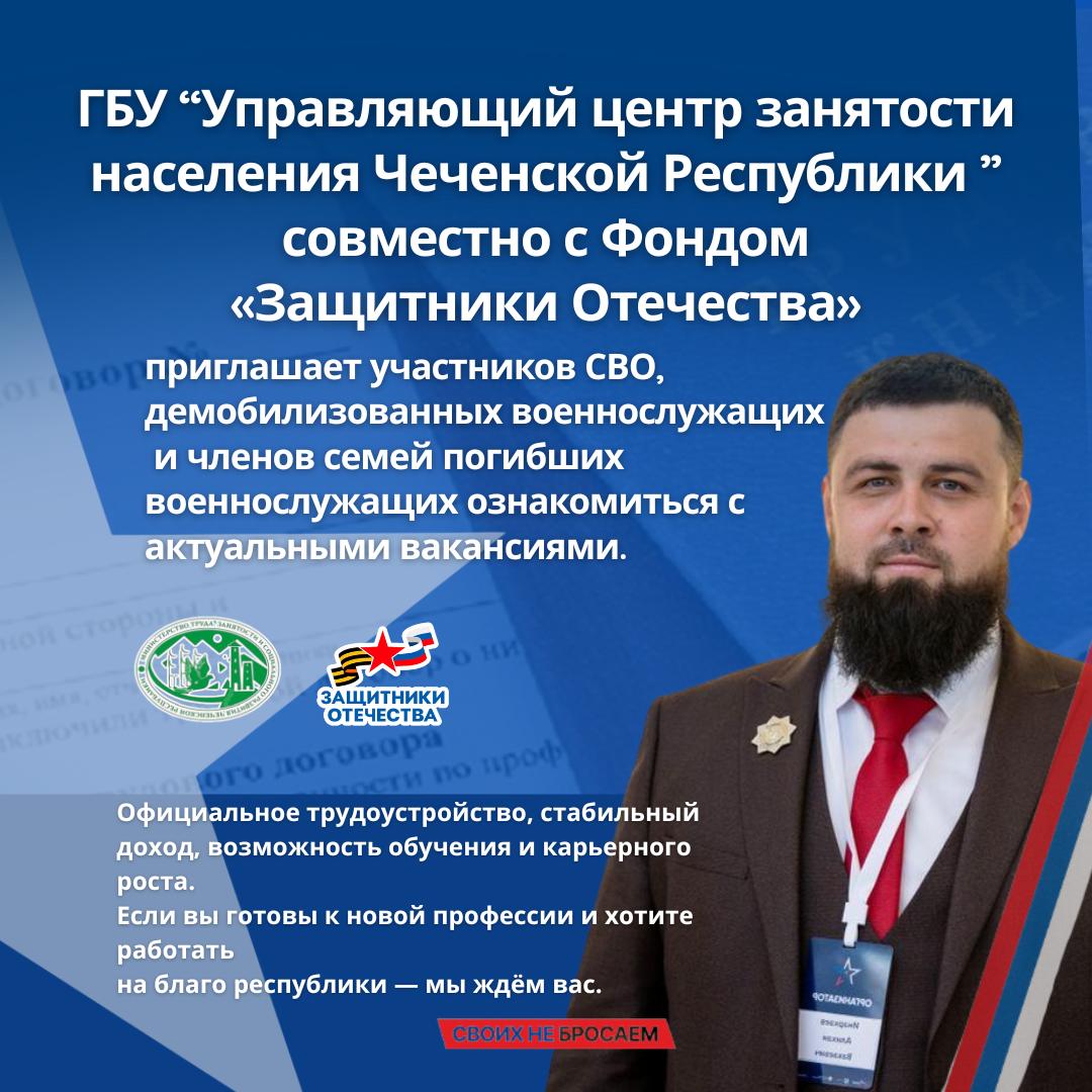 Филиал Государственного Фонда поддержки участников специальной военной операции «Защитники Отечества» в Чеченской Республике совместно с Государственным бюджетным учреждением «Управляющий Центр занятости населения» Министерства труда, занятости и ...